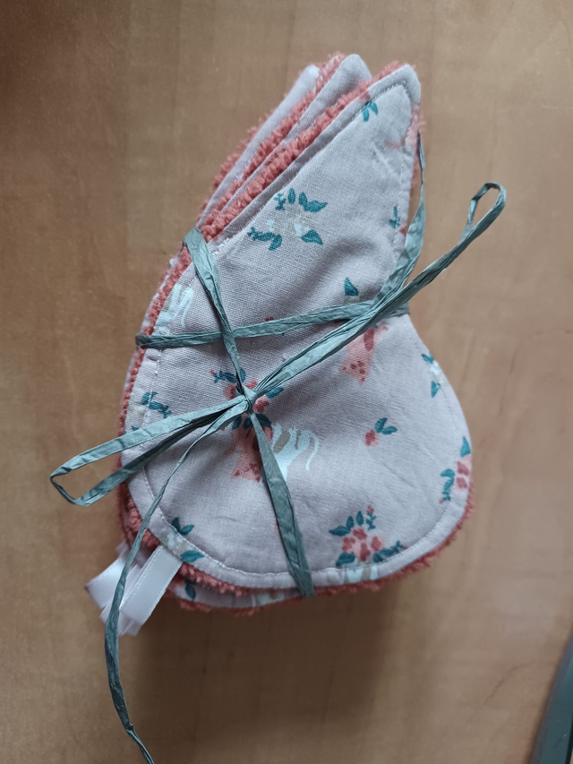 Coton démaquillant réutilisable, en forme de gouttes de 13 cm de long, tissu bambou terracotta et tissu coton imprimé rose chat avec un ruban rose.