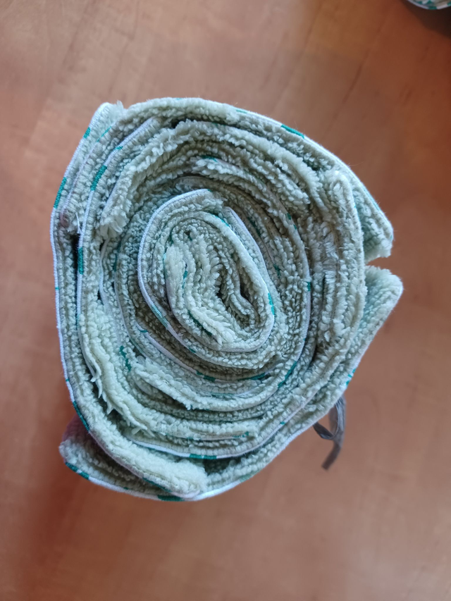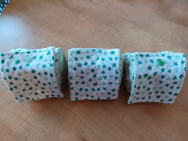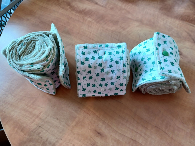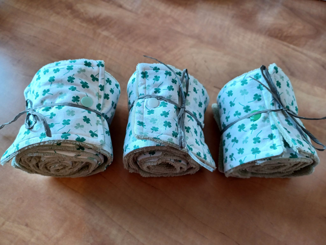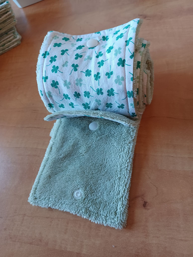 Ce rouleau de papier toilette ce compose de 15 feuilles de 10 x 12 cm en tissu coton blanc imprimé trèfle et tissu bambou vert anis que vous pouvez assembler grâce aux pressons de couleurs assorties.