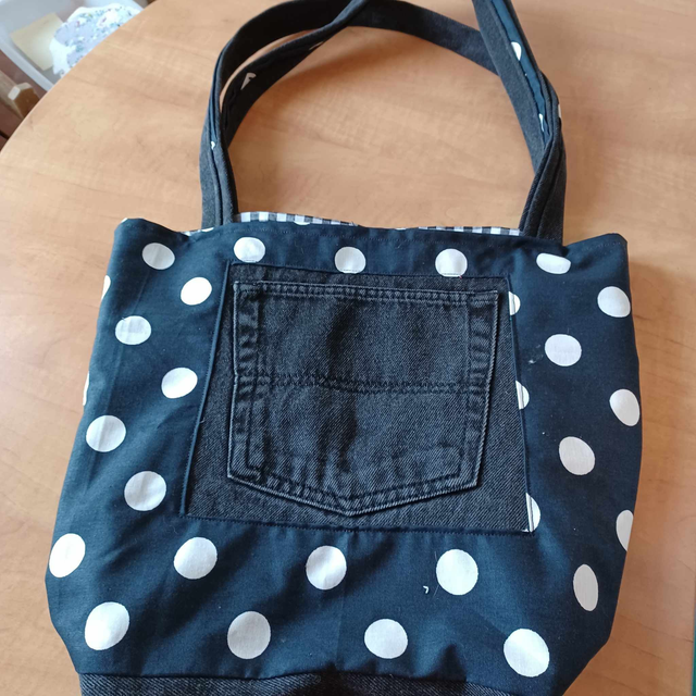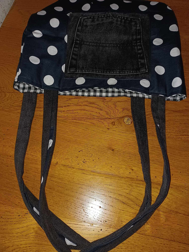 Sac en jeans noir et tissu coton noir à poids blanc avec poche, tissu intérieur en coton vichy noir et blanc: hauteur 39 cm, longueur 30 cm et largeur 15 cm